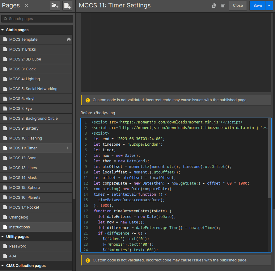 2. Go to the properties of the "MCCS 11: Timer" page and paste this code into the "Before </body> tag" field: